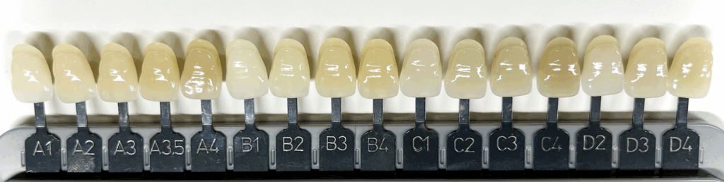 ホワイトニングの効果を説明する際に使われるのが「シェードガイド」と呼ばれる色見本です。A1〜D4までの番号で歯の色を分類し、どのくらい白さが改善されたかを客観的に評価します。